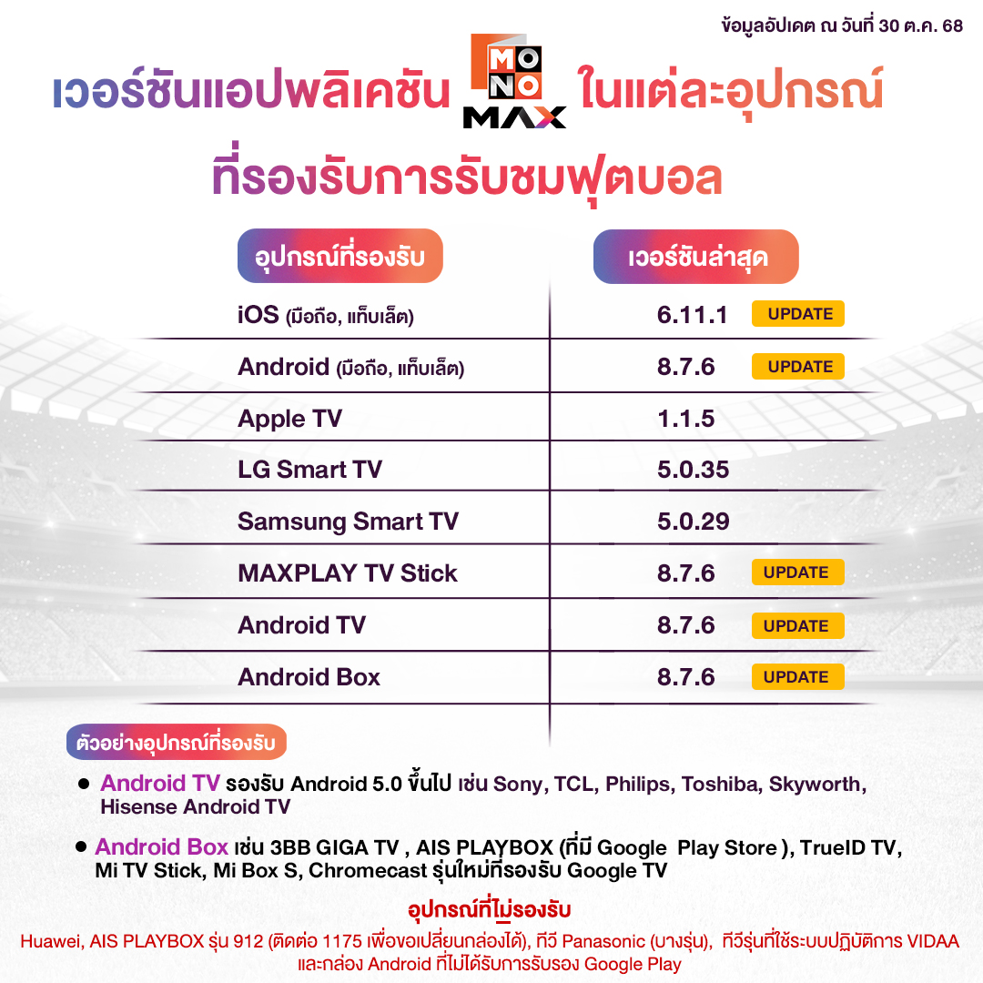- ทีวี Hisense และ ทีวี Toshiba ที่มีระบบปฏิบัติการ VIDAA จะไม่รองรับการติดตั้งแอป Monomax
