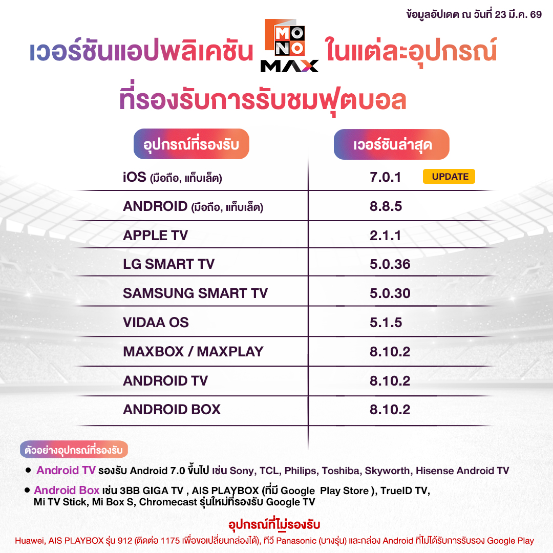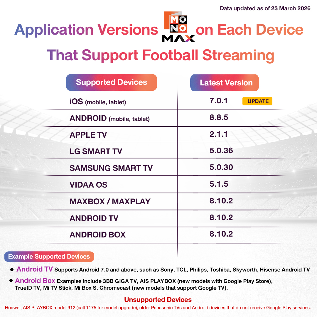 - Android TV รองรับ Android 7.0 ขึ้นไป เช่น Sony, TCL, Philips, Toshiba, Skyworth, Hisense Android TV
