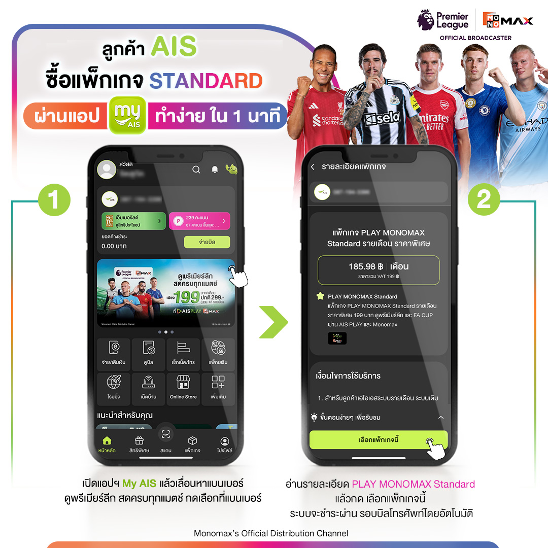วิธีการซื้อแพ็กเกจสแตนดาร์ด เพื่อรับชมเนื้อหากีฬาสำหรับลูกค้า AIS