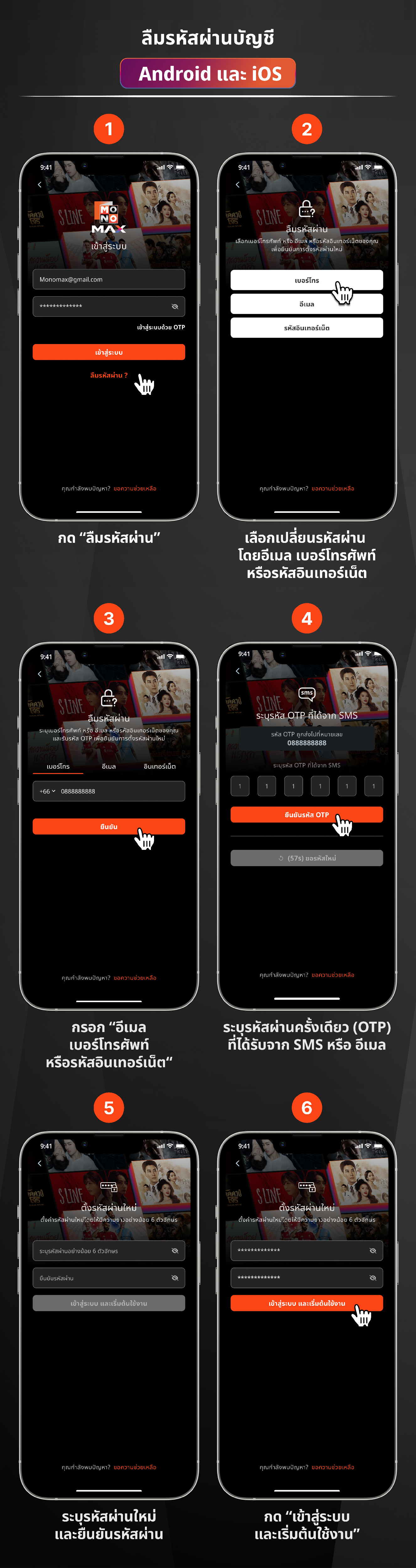 - บนแอพลิเคชัน เลือก ลืมรหัสผ่าน ในหน้าเข้าสู่ระบบ หรือคลิก https://www.monomax.me/account/forget_password