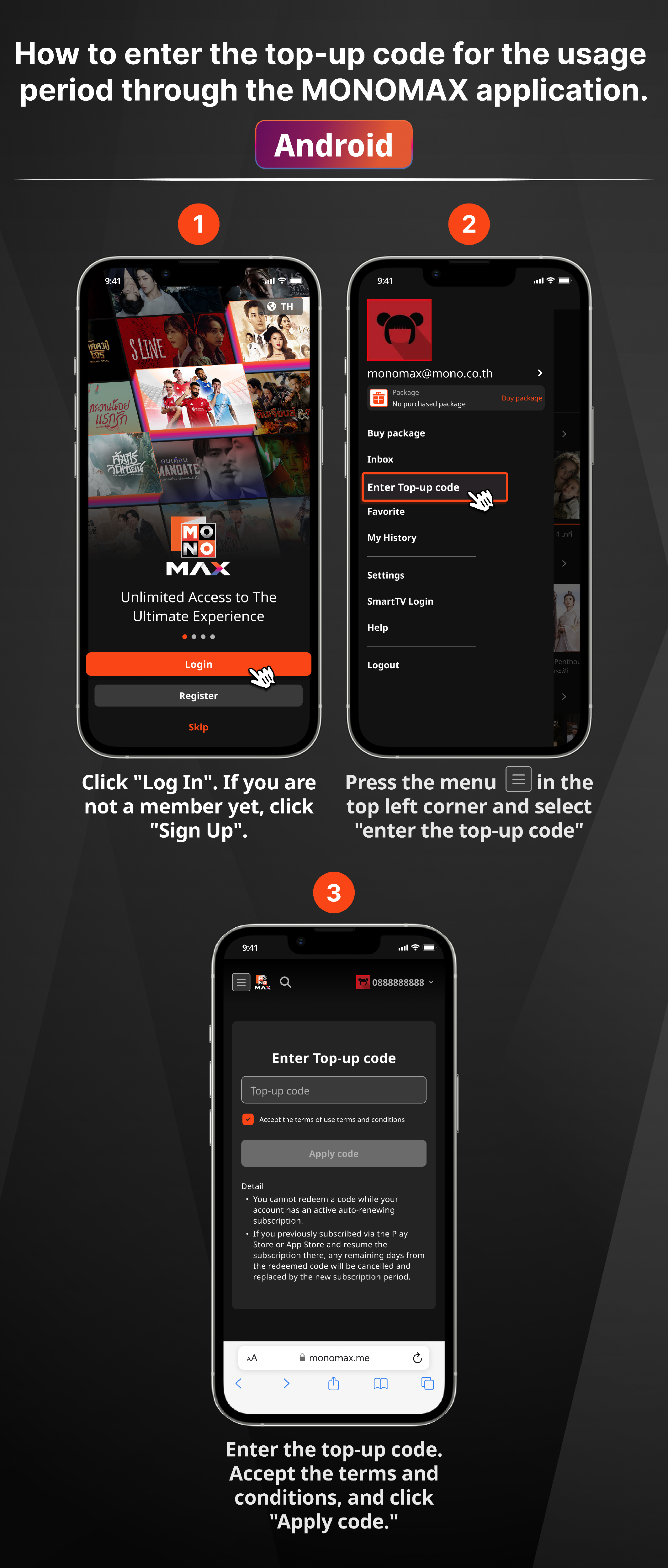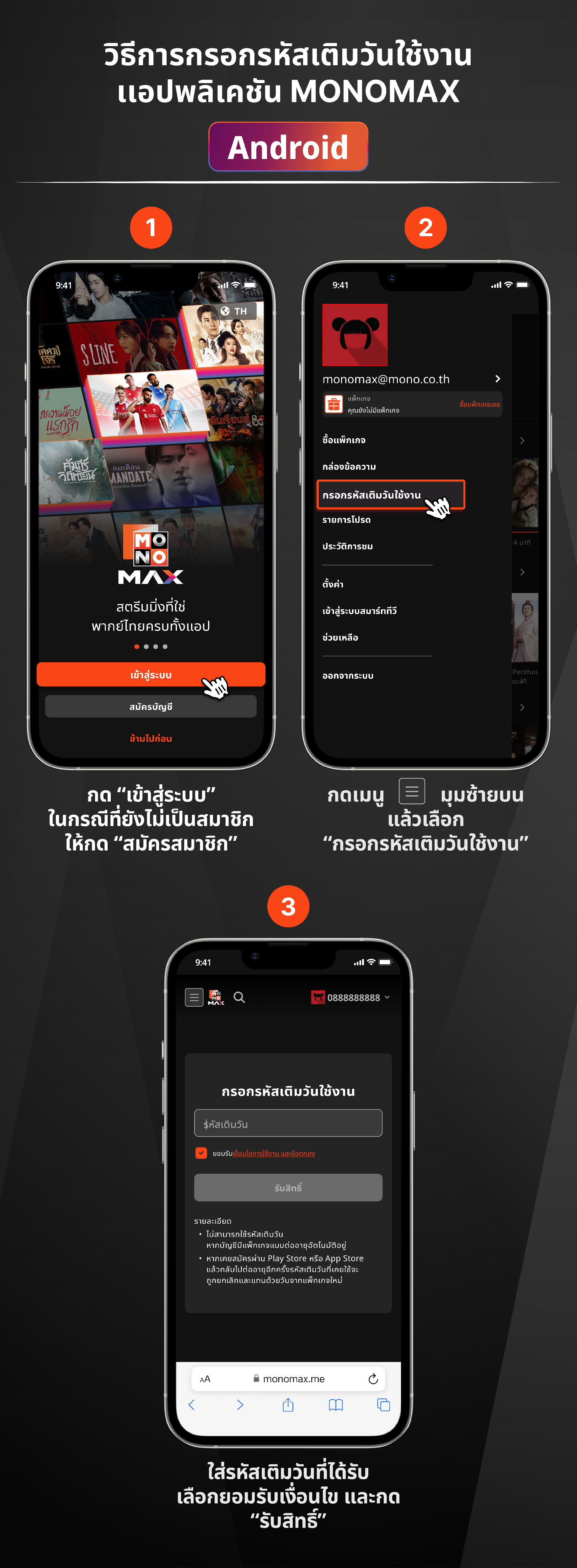 - สำหรับ iOS การกรอกรหัสเติมวันใช้งานจะสามารถใส่ได้แค่บนเว็บไซต์ https://www.monomax.me เท่านั้น