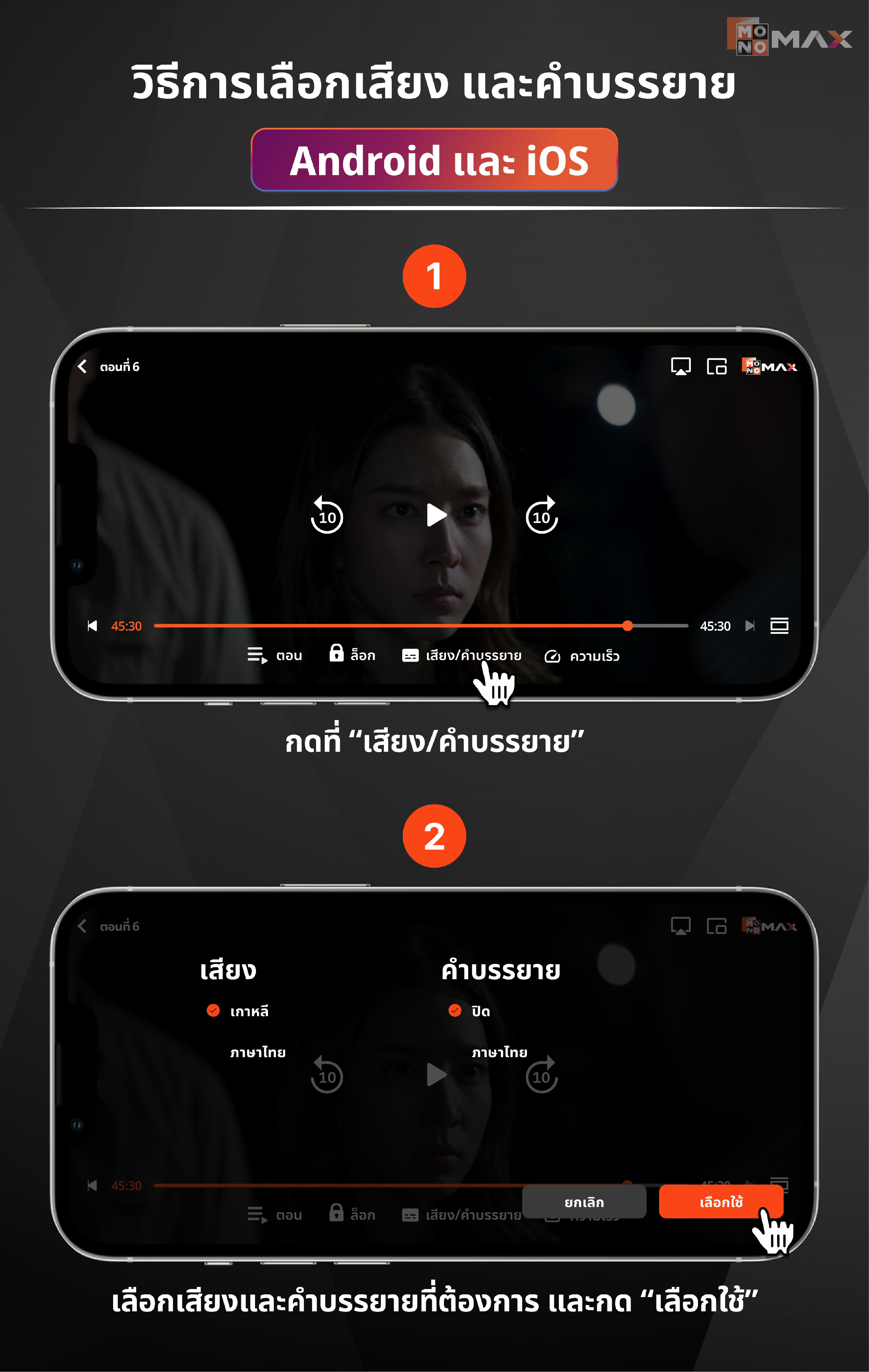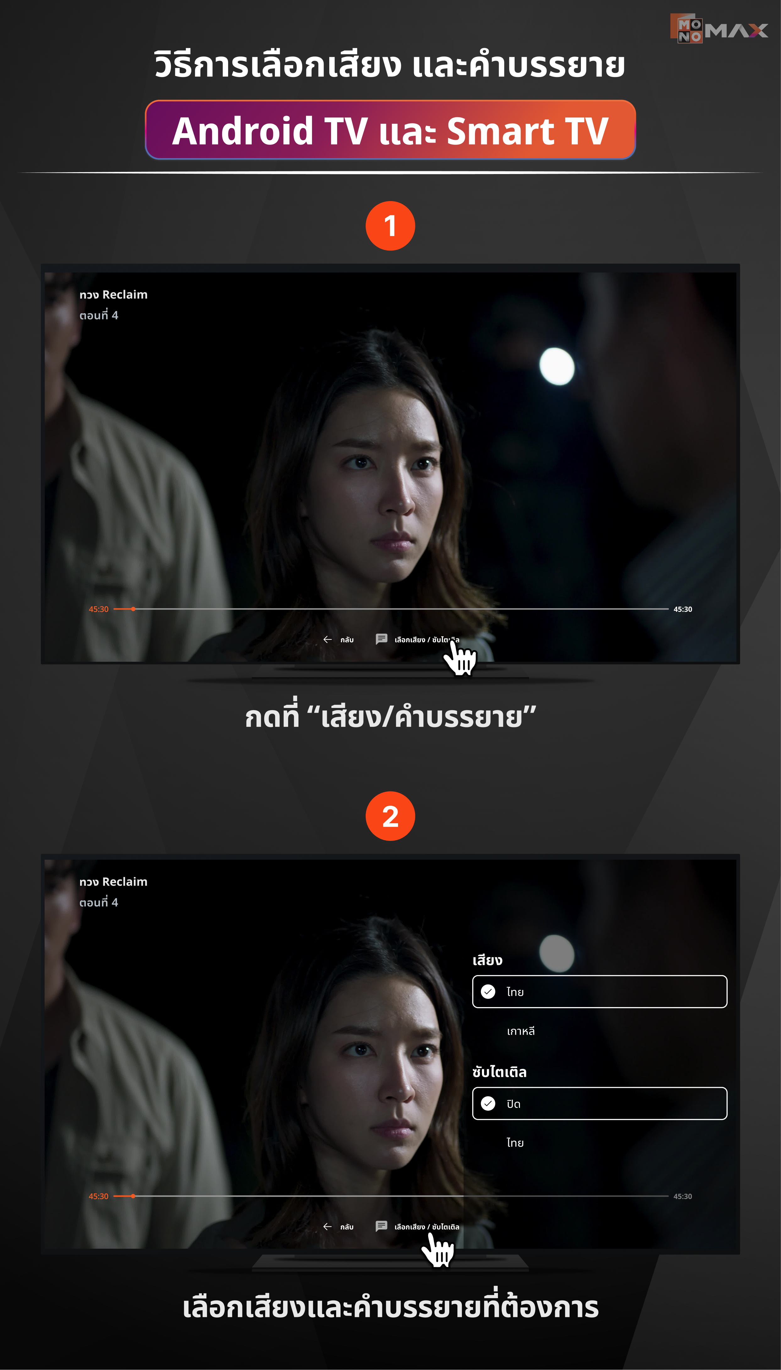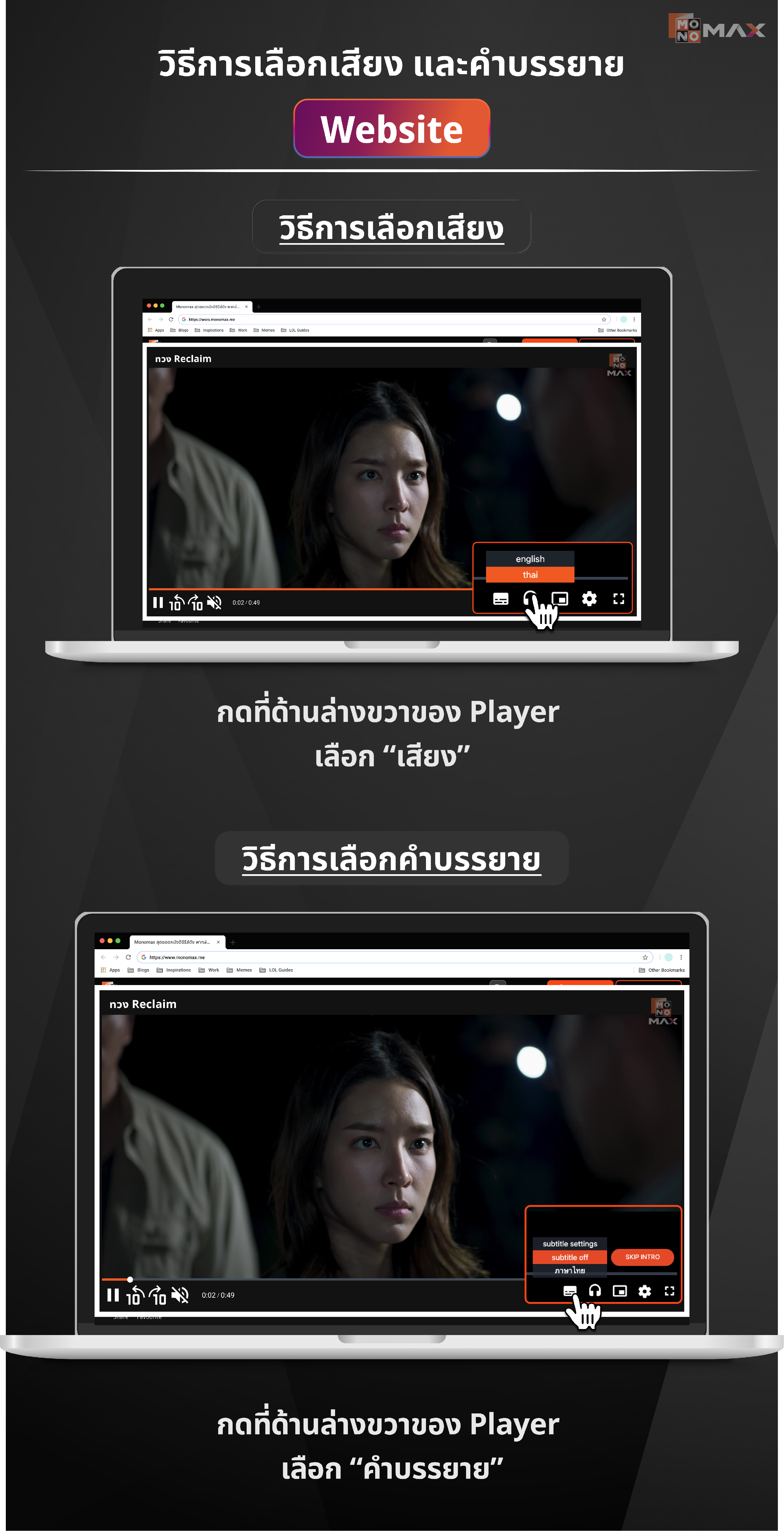 MONOMAX สามารถเลือกได้ 2 ภาษา ได้เเก่ ภาษาไทย เเละภาษาต้นฉบับ