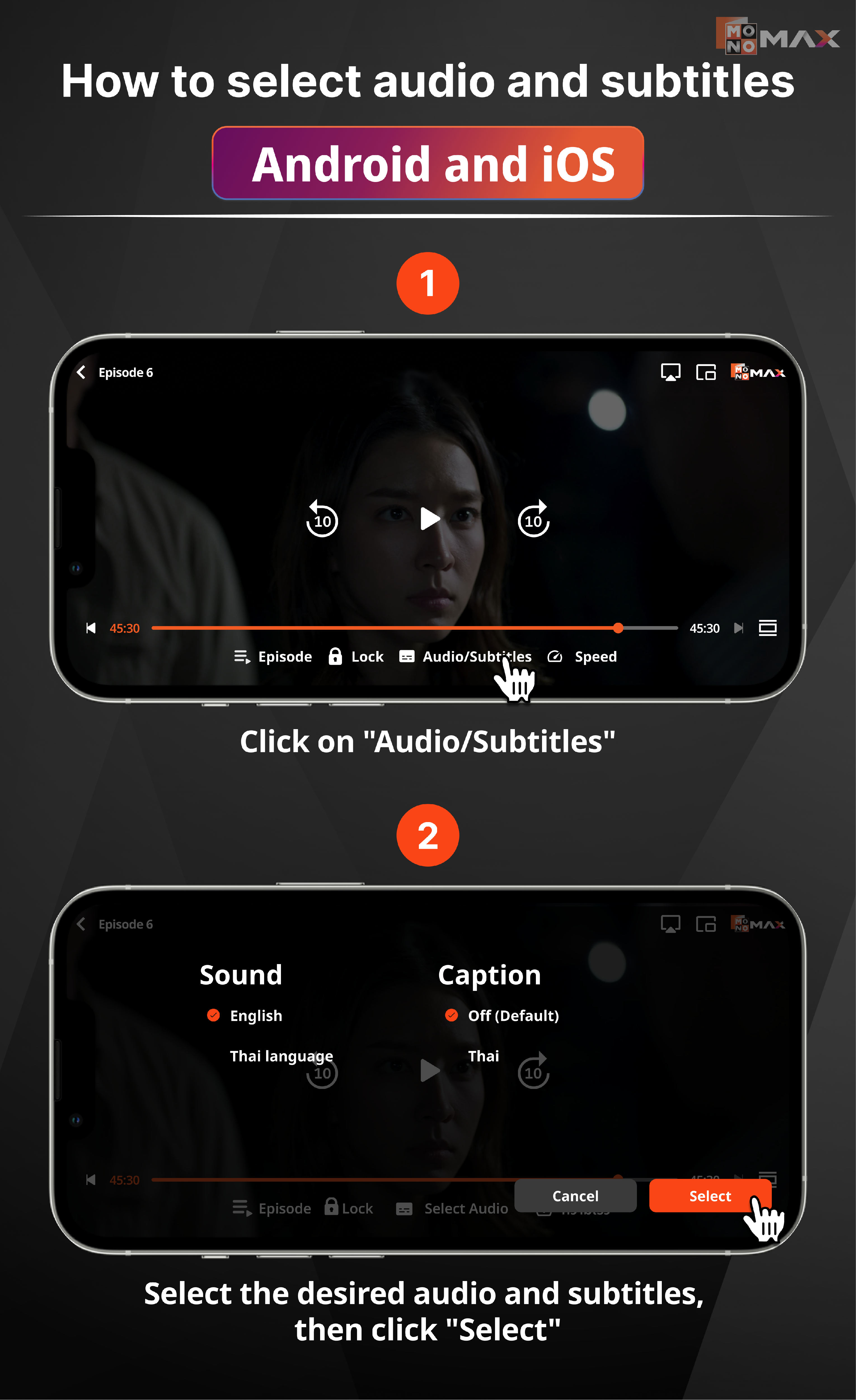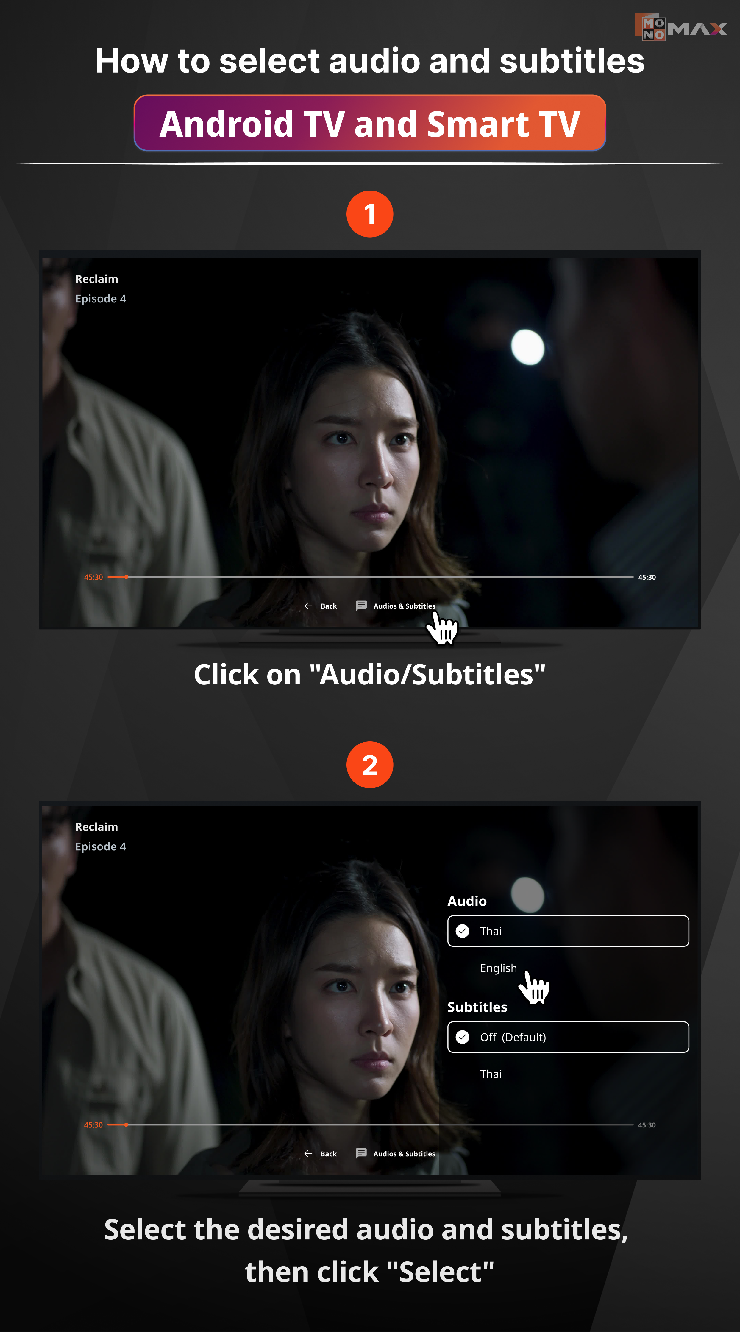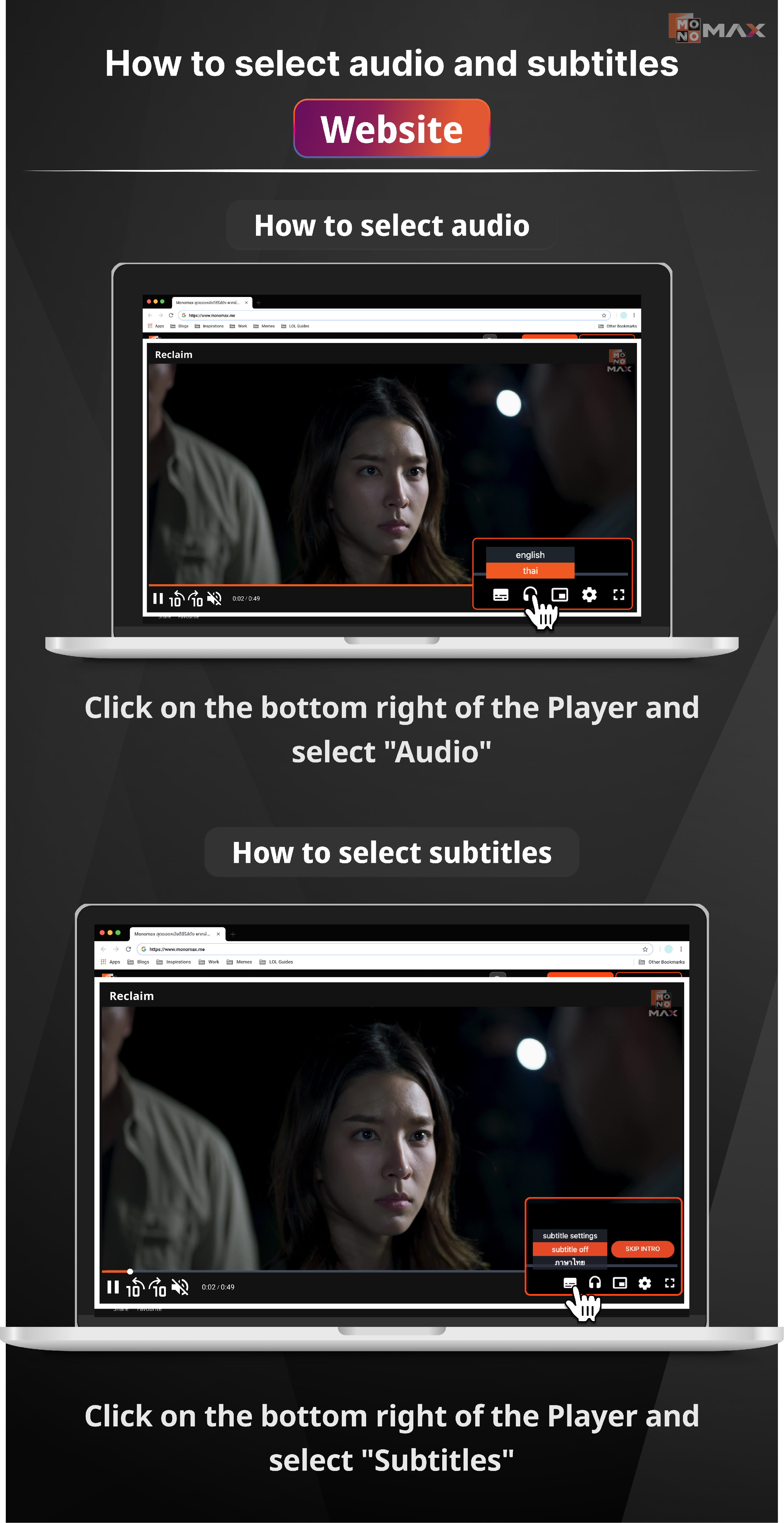 MONOMAX สามารถเลือกได้ 2 ภาษา ได้เเก่ ภาษาไทย เเละภาษาต้นฉบับ