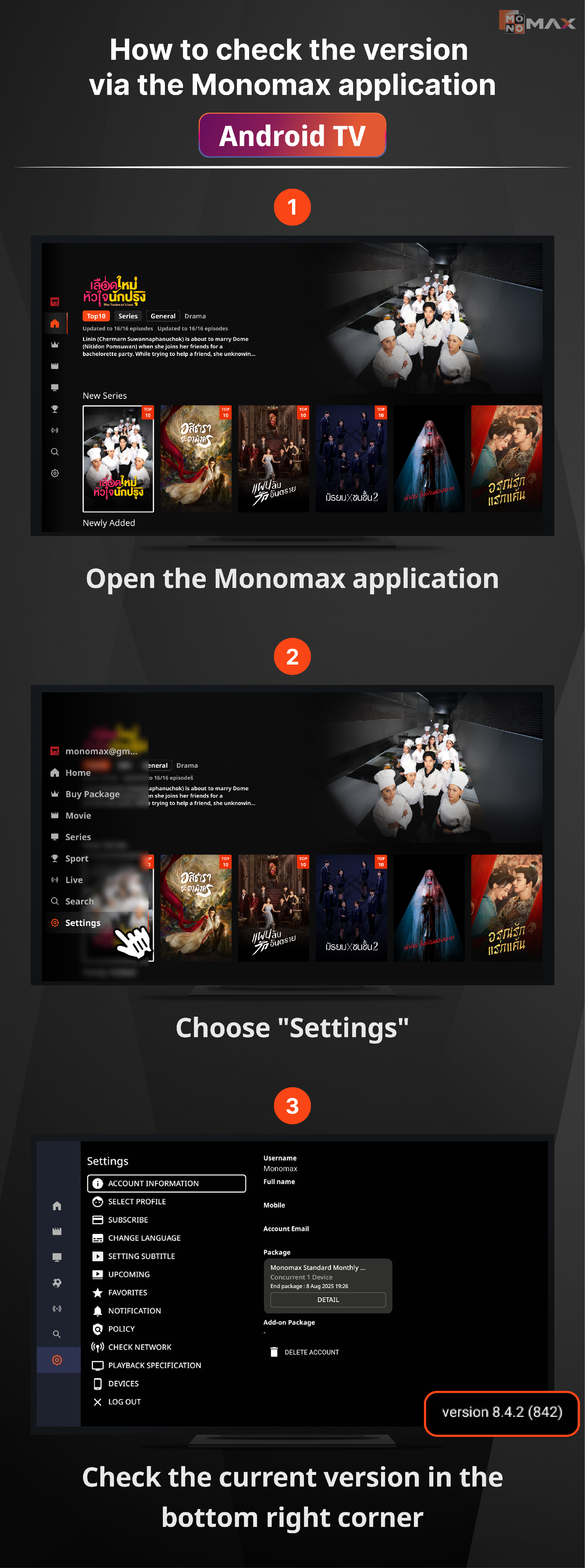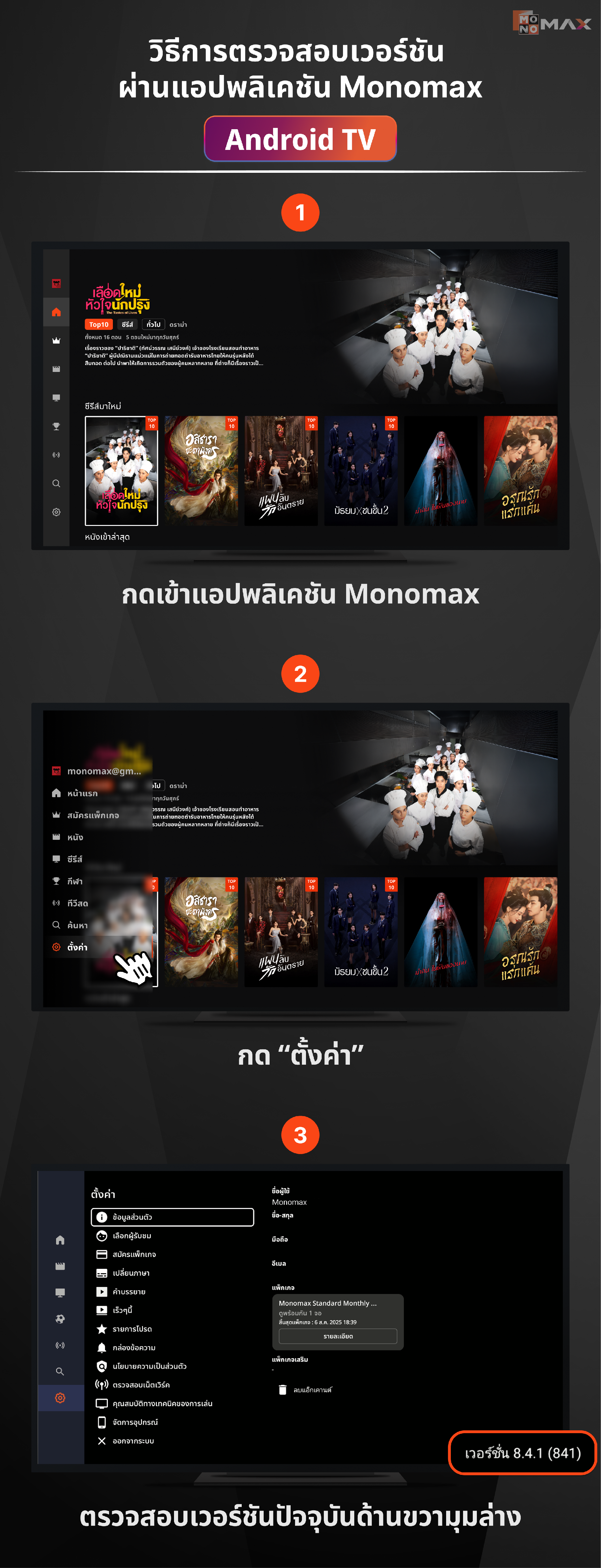 วิธีการตรวจสอบเวอร์ชันผ่านแอปพลิเคชัน Monomax บน Android TV