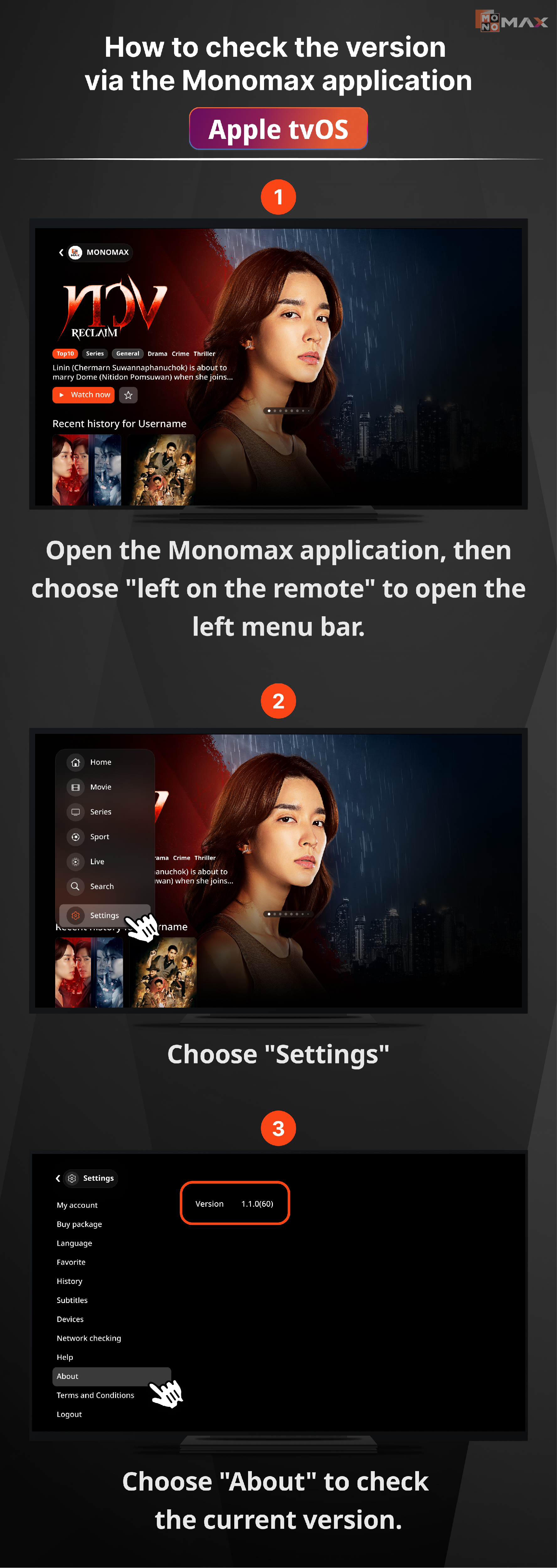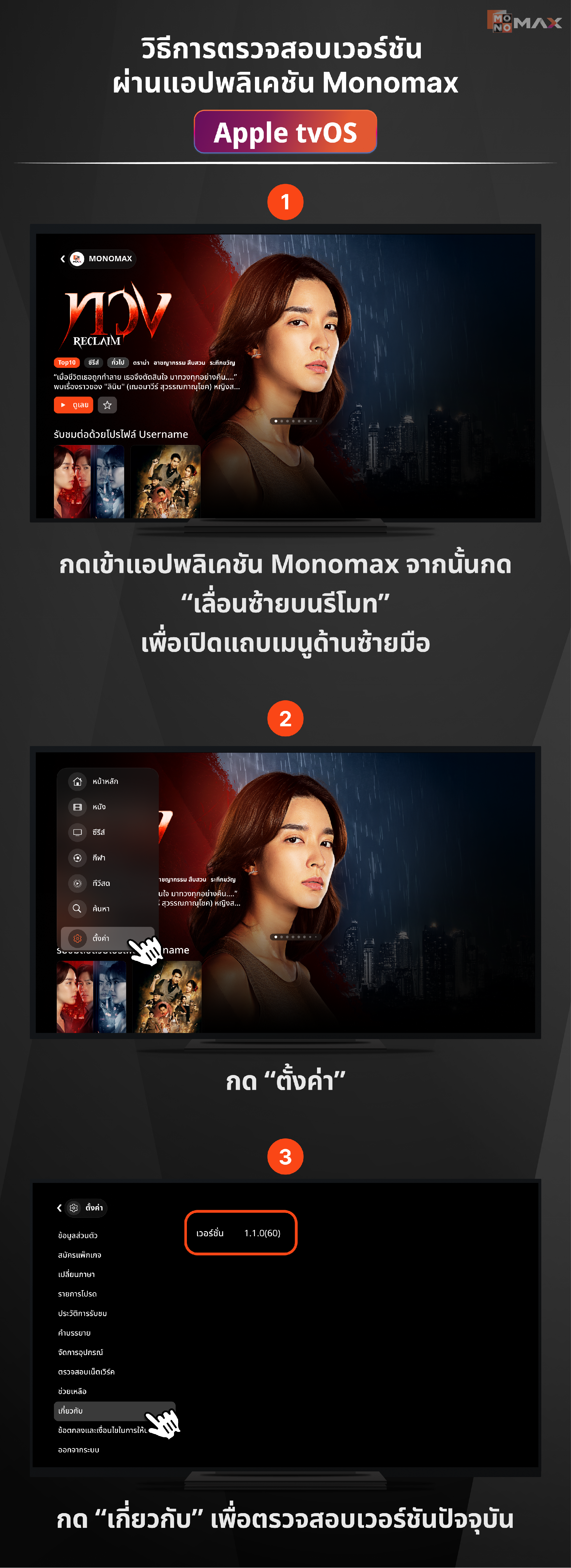 วิธีการตรวจสอบเวอร์ชันผ่านแอปพลิเคชัน Monomax บน Apple tvOS