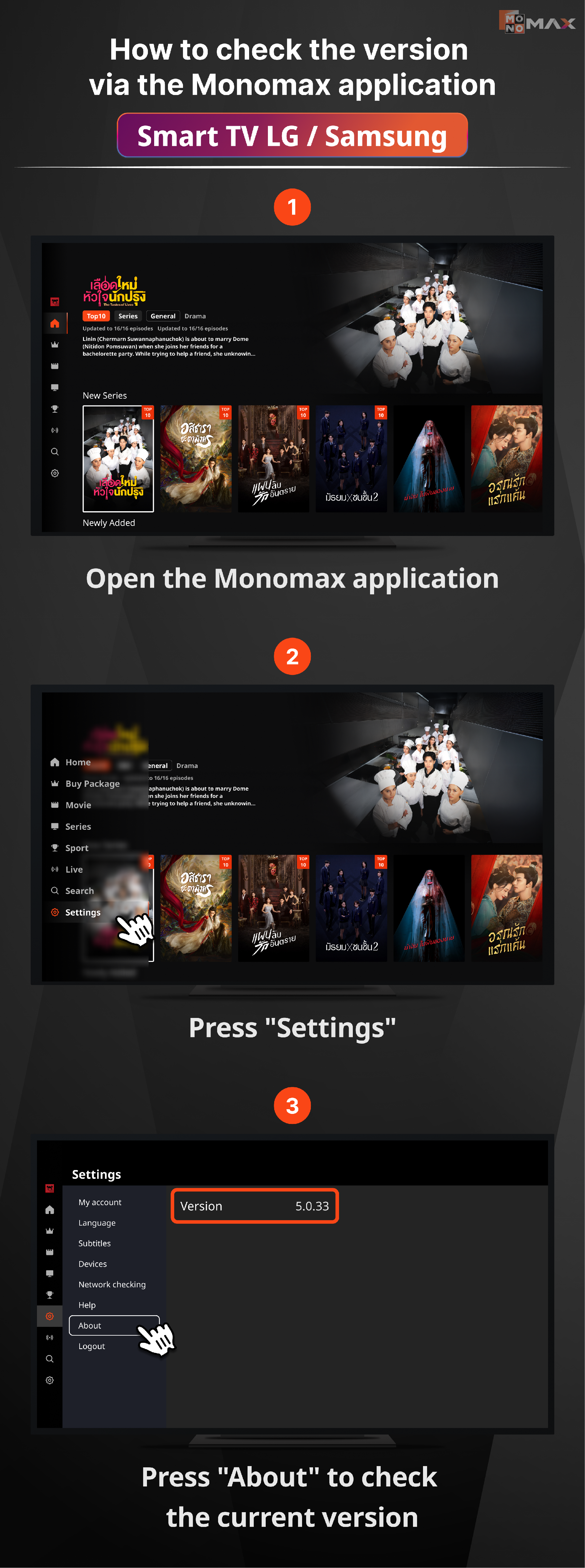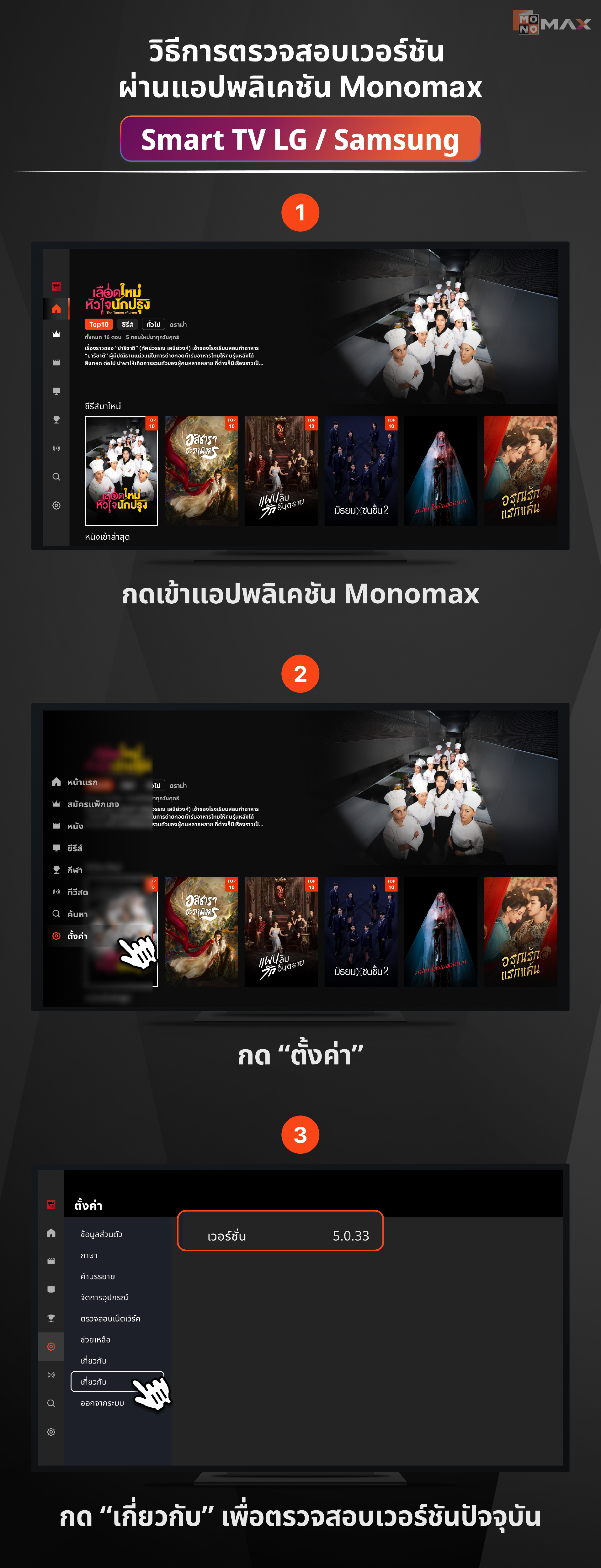 วิธีการตรวจสอบเวอร์ชันผ่านแอปพลิเคชัน Monomax บน Smart TV LG / Samsung